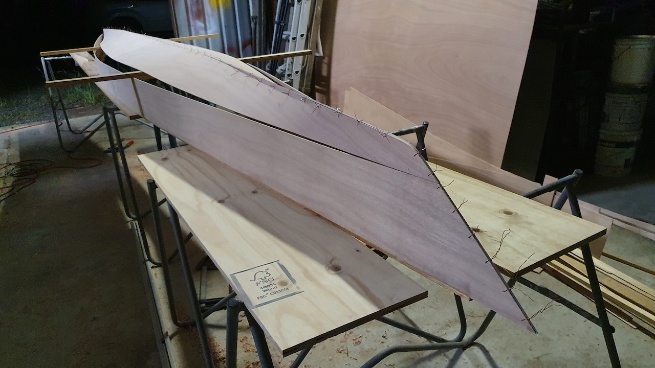 Creating the hull by stitching together the panels with copper wire, adding bulkheads, trueing the form, filletting and fibreglassing.Deckbeam