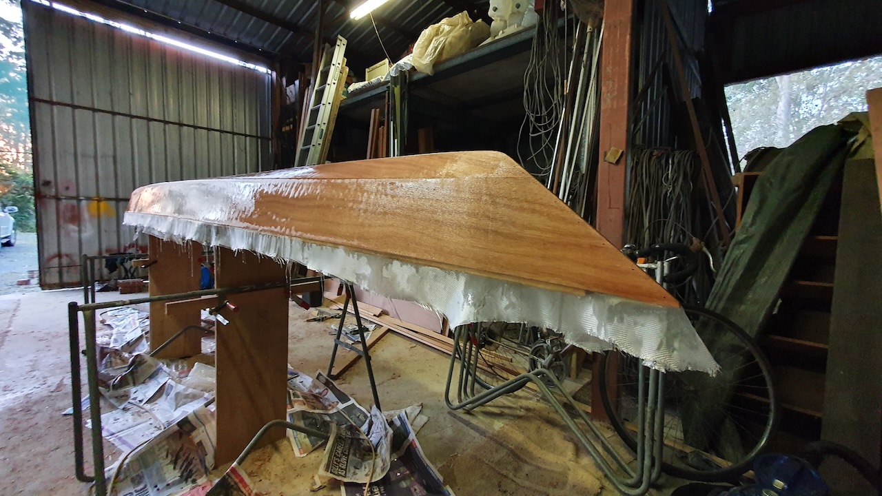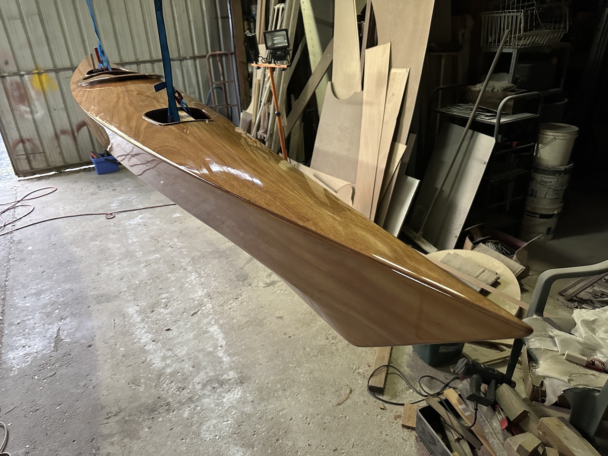 Adding the deck, coaming (also laminated, in-situ with plenty of clamps) and hatch trim. Lots of sanding, then a final polyurethane varnish to protect it all.