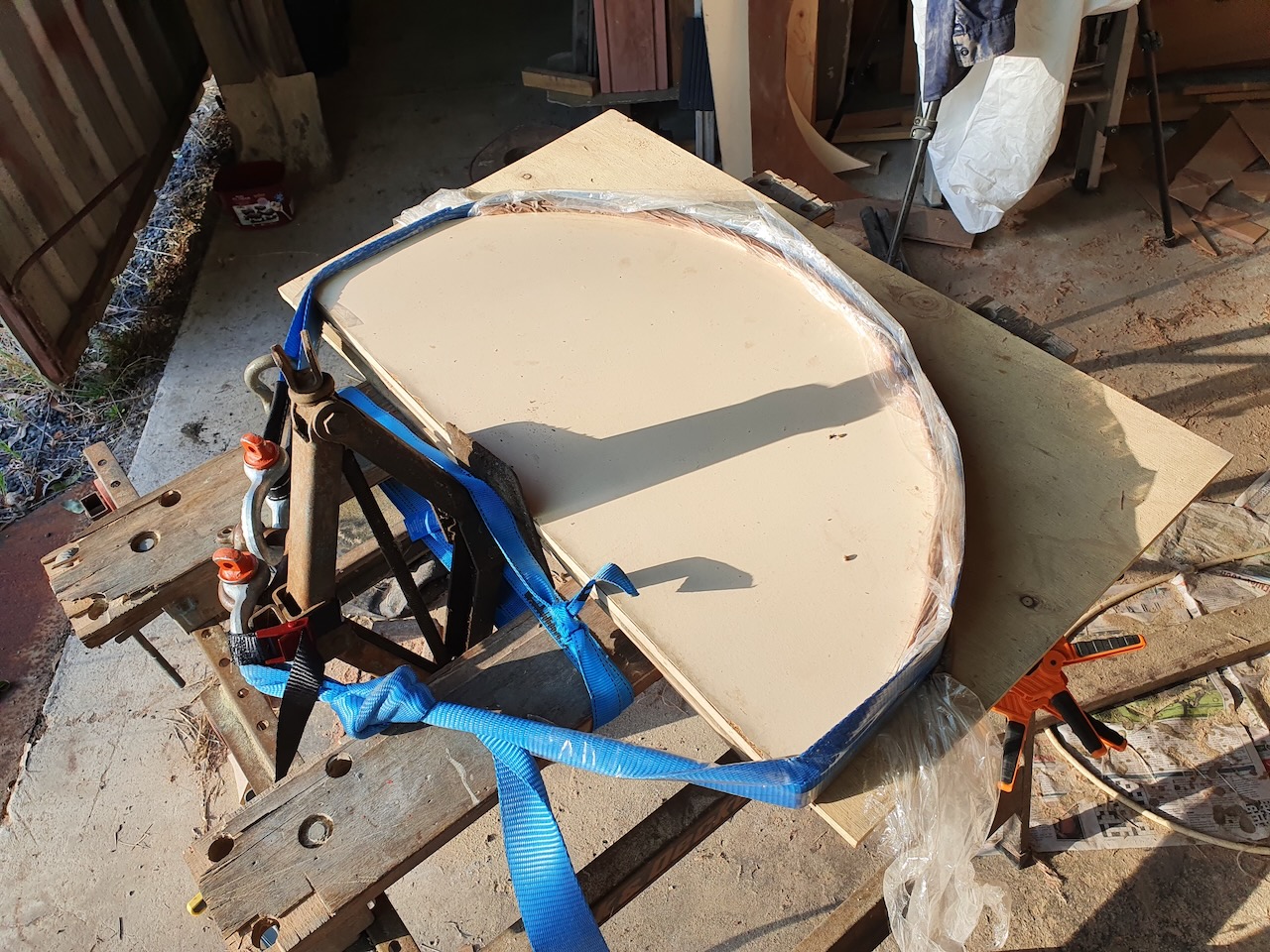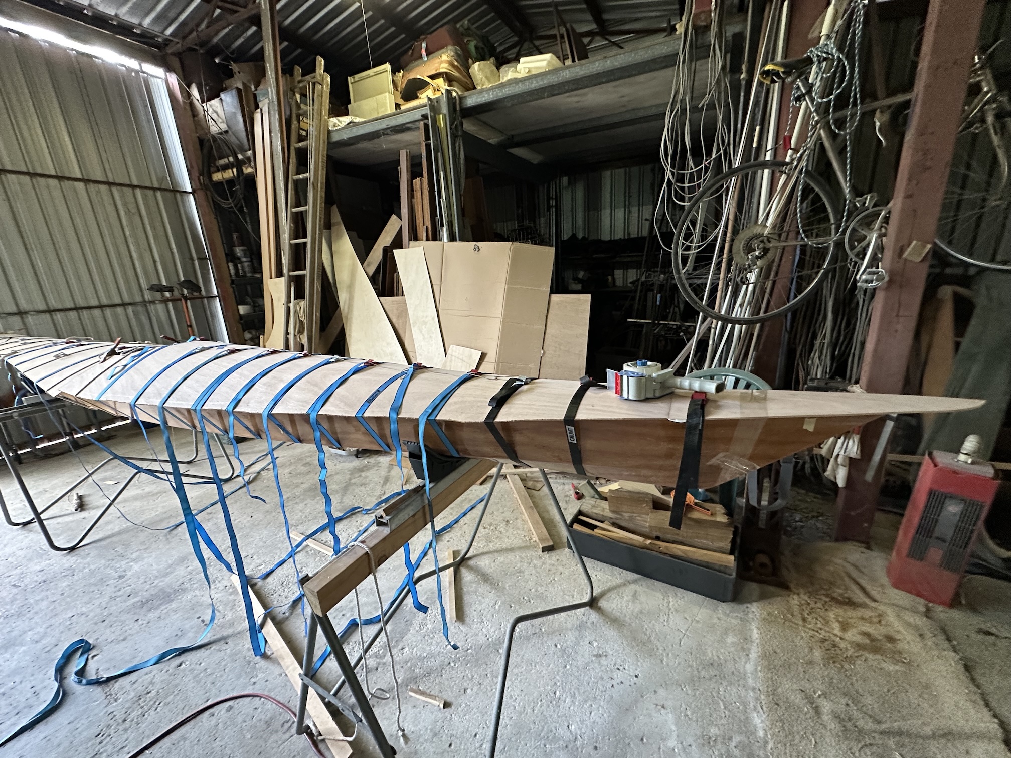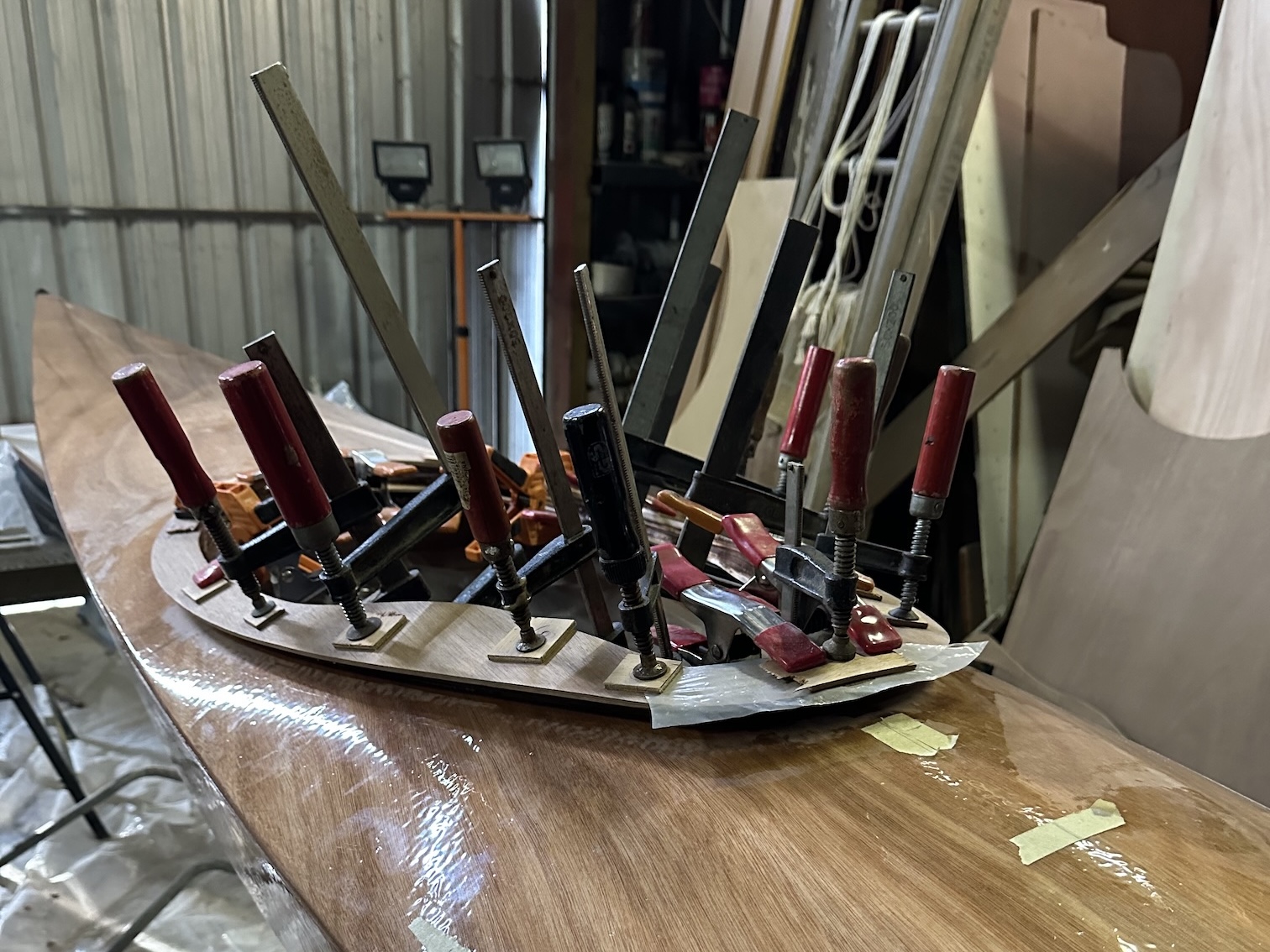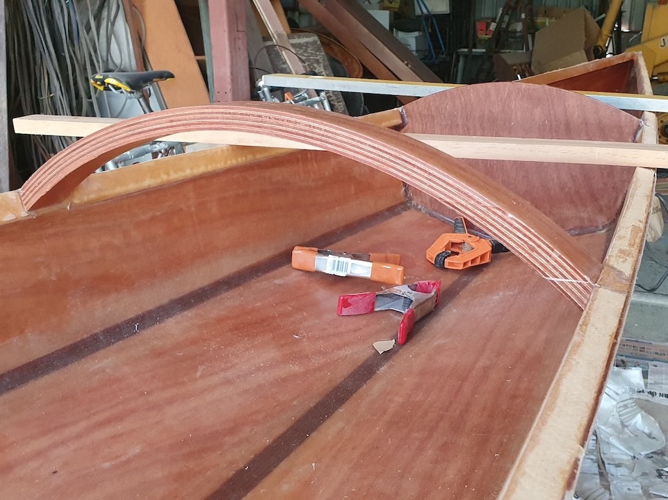 Creating the laminated deckbeam by stretching the plywood panels over a form. This goes over the cockpit area to support the deck shape.